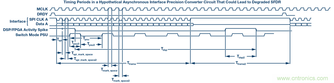 在圖15中,標記了各種定時周期,這很容易干擾SFDR或?qū)е露秳印H绻鸖PI通信未頻鎖到MCLK,則可能發(fā)生雜散。掌握布局技術(shù)是您緩解此問題的最大保障。頻率表現(xiàn)為混疊下行干擾源,但也作為拍頻和交調(diào)產(chǎn)物。例如,如果SPI在16.01 MHz下運行,MCLK在16 MHz下運行,則應(yīng)在10 kHz下發(fā)生雜散。