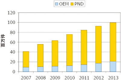 汽車導(dǎo)航市場中,根據(jù)ST公司的估計,2008年P(guān)ND的出貨量同比將增長43%,從2007年的3200萬件增長到4600萬件。主要增長動力依然來自車載導(dǎo)航市場的低于水準(zhǔn)的普及率,對市場的教育和推廣的力度依然不夠。低成本的OEM導(dǎo)航儀(兩用便攜導(dǎo)航儀)將會在中級汽車中開辟新的市場,預(yù)計到2012年在歐美新售的汽車中,車載導(dǎo)航儀占有率將超過25%。2007-2013年OEM儀表板內(nèi)置導(dǎo)航儀的年均增長率將達(dá)到15%,便攜式導(dǎo)航儀的增長速度為16%,預(yù)計到2013年導(dǎo)航市場規(guī)模將達(dá)到汽車影響的水平。