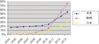 圖2 北美、歐洲、日本緊急呼叫系統(tǒng)市場占有率