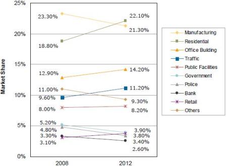 市場對(duì)安防產(chǎn)品的需求多種多樣,涉及眾多領(lǐng)域,包括制造、政府、金融、運(yùn)輸、教育、醫(yī)療保健、住宅及商業(yè)樓宇。在國際市場,安防產(chǎn)品的主要用戶是政府、工業(yè)及個(gè)別家庭。在中國,制造業(yè)、住宅與商業(yè)樓宇是營業(yè)收入排在前三位的三大市場領(lǐng)域,合計(jì)所占份額超過55%。