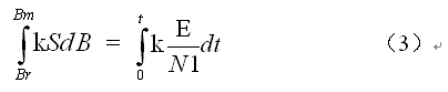 上式中,k是一個與單位制相關(guān)的系數(shù),S為變壓器鐵心的導(dǎo)磁面積,B為磁感應(yīng)強(qiáng)度,也稱磁通密度,即:單位面積的磁通量。把(2)式代入(1)式,并進(jìn)行積分: