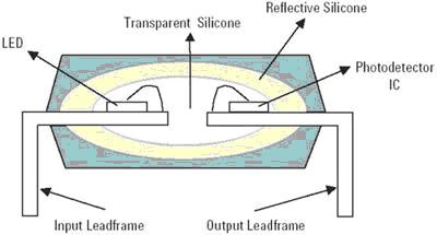 光電二極管芯片采用兩個(gè)透明的層:SiO2鈍化/絕緣和光傳導(dǎo)聚酰亞胺。LED使用透明的連接層穩(wěn)固地連接到光電二極管上。IC使用銀環(huán)氧樹脂,通過(guò)模具連接到引線框上。介電材料使用光傳導(dǎo)環(huán)氧樹脂連接到IC上。LED模具使用光傳導(dǎo)環(huán)氧樹脂連接到介電材料上。最后,組件使用焊接線和澆鑄。它使用標(biāo)準(zhǔn)模具連接工藝,完成所有放置,封裝在單次不透明澆鑄化合物中完成澆鑄。