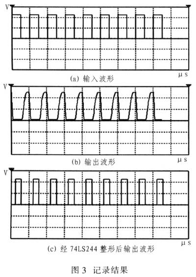 調(diào)試中,輸入周期為100μs,占空比為1/2的+5V方波,對(duì)一路光耦的輸入端波形和經(jīng)過(guò)20m長(zhǎng)線后接收光耦的輸出端波形以及經(jīng)過(guò)74LS244整形后的波形進(jìn)行記錄。記錄結(jié)果如圖3所示。