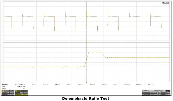 為了把5Gbps速率的數(shù)據(jù)傳送較遠(yuǎn)的距離,USB3.0的發(fā)送端使用了去加重技術(shù),這項測試可以測量DUT的去加重程度是否滿足規(guī)范要求(要求在-3dB到-4dB之間)。測試時DUT發(fā)送出CP7碼流,CP7碼型由50-250個連續(xù)的1和50-250個連續(xù)的0重復(fù)交替組成,而且是添加了去加重的信號波形。圖3為某USB3.0芯片的去加重測量結(jié)果,該芯片采用了-3.47dB的去加重。