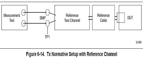 在USB3.0的TX的眼圖和抖動測試中,測量的是待測試信號經(jīng)過參考測試信道后TP1點的眼圖和抖動。如下圖4中的Reference test channel即為參考測試信道,在規(guī)范中定義了long channel、short channel和3米電纜三種參考測試信道。如果使用long channel或者較長電纜,信號到達(dá)接收端時衰減比較大,眼圖已經(jīng)閉合,USB3.0芯片接收端使用了CTLE均衡器對信號進(jìn)行均衡后(CTLE均衡器介紹見本文最后一部分),信號眼圖的質(zhì)量將大大改善,所以要求測試儀器分析出CTLE均衡器處理后信號的眼圖和抖動。