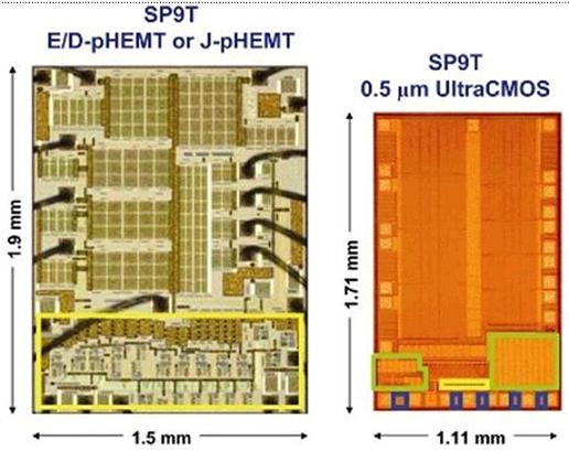隨著多頻段手機越來越流行,對高整合度、小型天線開關(guān)的需求也越來越迫切。UltraCMOSSP7T開關(guān)現(xiàn)在已經(jīng)開始量產(chǎn),SP9T也在2007年底投入量產(chǎn)。在外形方面,GaAsSP7T為1.6x1.5mm,而采用0.5umSOS制程、具有相等或較小和較大信號性能的相似SP7T開關(guān)設(shè)計只有1.2x1.0mm,面積縮小了一半。目前已經(jīng)可用的GaAsE/DpHemt或J-pHemtSP9T開關(guān)外形尺寸為1.9x1.5mm。與之相較,采用UltraCMOS0.5um制程制造的SP9T外形尺寸為1.7x1.1mm(圖3),它不需要外部ESD元件和性能增強匹配元件。依照UltraCMOS發(fā)展規(guī)劃,0.25um版本的SP9T尺寸將達到1.32x1.29mm。