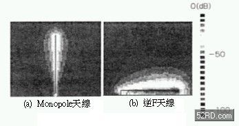 由上式可知如果縮任意小天線大小的話,Pr會比Pd小導(dǎo)致放射效率大幅降低,這種現(xiàn)象尤其是天線附近的電磁界更加明顯。圖2是提供相同電力給兩種天線時,天線附近的實(shí)際電界分布狀態(tài),圖中的單極(Monopole)天線高度為λ/4(此處λ表示天線頻率的對應(yīng)波長)屬于中等大小天線,此時單極天線最大強(qiáng)度大約是-20dB。