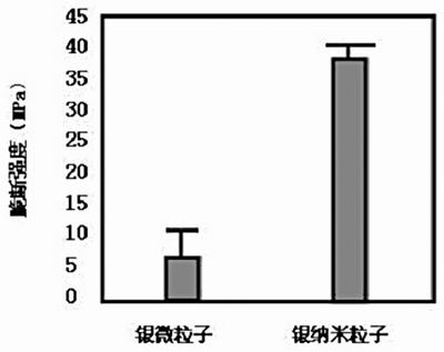 日本大阪大學(xué)應(yīng)用銅質(zhì)圓板型試驗(yàn)片作銀納米粒子連接試驗(yàn),分別測(cè)出了銀微米粒子(平均粒徑為100nm)和銀納米粒子的脆斷強(qiáng)度(見圖7)。其中,該試驗(yàn)是在300℃、保溫300min、加壓5Mpa的條件下進(jìn)行的。如圖7所示,納米粒子連接與微粒子連接相比,顯示出了很高的脆斷強(qiáng)度。