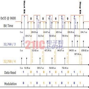 UART數(shù)據(jù)用10,922波特或8,192波特的UART接收。由于UART在傳輸中間點對數(shù)據(jù)進行采樣以補償抖動,因此該點已經被選擇為接收UART的采樣點。在沒有行抖動的理想情況下,10,922波特UART對第三數(shù)據(jù)位的開始兩次讀數(shù)都會是錯誤的而8,192波特的UART由于會完全遺漏第三位,很快就將出錯。由于低功耗應用的理想時鐘是低功耗實時時鐘模式,這使得在低功耗環(huán)境中處理很困難。解決這一問題的最好辦法就是將µC與調制技術結合使用,用32kHz振蕩器提供非常精確的2,400波特,并完全能支持9,600波特(參見圖3)。