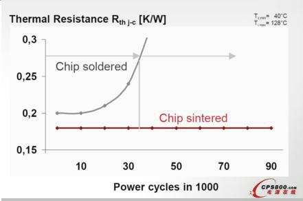 圖2.燒結芯片與焊接芯片的功率循環(huán)能力對比