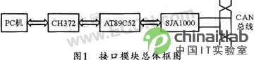 本文所介紹的USB-CAN轉接技術總體框圖如圖1所示,該設計分兩大部分:一是與主機USB接口相連的USB控制部分;二是與CAN總線相連的CAN控制器部分。兩者中間通過單片機聯系起來。USB控制部分用USB接口控制芯片CH372來實現數據的接收和發(fā)送;CAN控制器SJA1000用來實現CAN總線間的數據通信。單片機用來進行相應的控制、協調以及系統(tǒng)的通信。