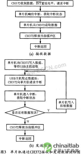 CH372芯片專門用于處理USB通訊。在接收到數據或發(fā)送完數據后,CH372將以中斷方式通知單片機進行處理。單片機通過CH372接收和發(fā)送數據的流程圖如圖3所示。