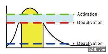 電容式感測(cè)器利用基線值和一連串的臨界值來(lái)決定感測(cè)器的觸發(fā)狀態(tài)。觸發(fā)區(qū)域的上下限能對(duì)感測(cè)器的觸發(fā)產(chǎn)生遲滯作用。要觸發(fā)感測(cè)器就必須要超越較高的臨界值,而且被觸發(fā)的狀態(tài)會(huì)一直持續(xù)到計(jì)數(shù)值降到較低的臨界值以下為止,如(圖四)。