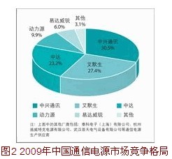 根據(jù)2009年三大運營商對通信電源的集采結果,中興通訊、艾默生、中達三家廠商占據(jù)了約80%的市場份額,三家廠商的出貨量份額相差不大。其中中興通訊以30.5%的份額,位居中國通信電源市場出貨量排名第一位。艾默生位居第二,占27.4%,其后是中達,占23.2%。圖2是2009年中國通信電源市場競爭格局(以運營商集采數(shù)據(jù)為主要考量基礎)。