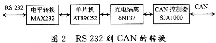 RS232串口的幀格式為:1位起始位,8位數(shù)據(jù)位,1位可編程的第9位(此位為發(fā)送和接收的地址/數(shù)據(jù)位),1位停止位。而CAN的數(shù)據(jù)幀格式為:幀信息+ID+數(shù)據(jù)(可分為標(biāo)準(zhǔn)幀和擴(kuò)展幀兩種格式)。因此,設(shè)計時就需要有一個微控制器來實現(xiàn)電平和幀格式等的轉(zhuǎn)換,其轉(zhuǎn)換方式如圖2所示。