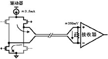 一個簡單的LVDS傳輸系統(tǒng)由一個驅(qū)動器和一個接收器通過一段差分阻抗為100Ω的導體連接而成,如圖1所示。驅(qū)動器的電流源(通常為3.5mA)來驅(qū)動差分線對,由于接收器的直流輸入阻抗很高,驅(qū)動器電流大部分直接流過100Ω的終端電阻,從而在接收器輸入端產(chǎn)生的信號幅度大約350mV。通過驅(qū)動器的開關(guān),改變直接流過電阻的電流的有無,從而產(chǎn)生“1”和“0”的邏輯狀態(tài)。在有些最新生產(chǎn)的LVDS接收器中,100Ω左右的電阻直接集成在片內(nèi)輸入端上了,如MAXIM公司的MAX9121/9122等。