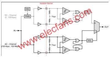 高速信號(hào)由AC通道來處理,信號(hào)在通道中首先從單端模式轉(zhuǎn)換為差分模式,然后被隔離層的電容-電阻網(wǎng)絡(luò)差分為許多瞬態(tài)。后面的比較器再將這些瞬態(tài)轉(zhuǎn)換為差分脈沖,從而設(shè)置和重置一個(gè)“或非”門觸發(fā)器。相當(dāng)于原始輸入信號(hào)的觸發(fā)器輸出饋至判定邏輯(DCL)和輸出多路復(fù)用器。DCL包括一個(gè)看門狗定時(shí)器,該定時(shí)器用于測量信號(hào)轉(zhuǎn)換之間的持續(xù)時(shí)間。如果兩個(gè)連續(xù)轉(zhuǎn)換之間的持續(xù)時(shí)間超出定時(shí)窗口(如低頻信號(hào)的情況下),則DCL則指示輸出多路復(fù)用器從AC-通道切換到DC-通道。