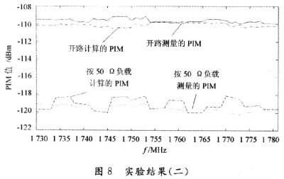 由以上的分析可知,這種計算方法計算出來的PIM值和真實的PIM值十分接近,并且隨頻率的變化趨勢一致。同時可以看出,在開路的時候所測量的 PIM明顯要比接負(fù)載的時候所測量的PIM要大,增大的PIM值是因為匹配不好所造成,當(dāng)然,相同的負(fù)載狀況在不同的頻率下呈現(xiàn)的匹配狀態(tài)是不一樣的。