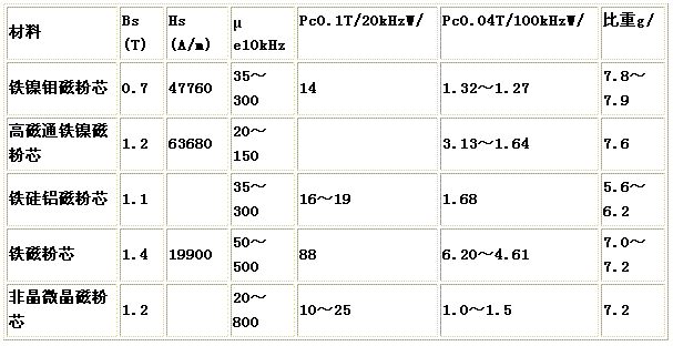對磁粉芯提出的指標有飽和磁通密度Bs、有效磁導率μe、有效品質(zhì)因數(shù)Qe、有效磁導率溫度系αμe及居里點、比重等。主要的磁粉芯的性能參數(shù)如表1所示。鐵鎳鉬磁粉芯國家標準型號為FN81,上海鋼鐵研究所型號為SN,美國阿諾德公司型號為MPP,磁導率高,工作環(huán)境適應(yīng)范圍廣,損耗低,但價格貴。鐵鎳高磁通磁粉芯國家標準型號為FN50,美國阿諾德公司型號為HF,飽和磁通密度高,磁導率中等,損耗也較低,價格較便宜,國內(nèi)外最近比較重視研究和使用。鐵硅鋁磁粉芯上海鋼鐵研究所型號為SA,美國阿諾德公司型號為MS,是一種價格較低,綜合性能指標較好的磁粉芯。鐵磁粉芯上海鋼鐵研究所型號SF,國外一般型號為IP,磁導率和飽和磁通密度高,但在高頻下?lián)p耗大,只適用于低頻和20kHz以下的中頻使用。由于價格便宜,可以把它加工成大型磁粉芯,代替硅鋼,作為大容量直流電源的濾波電抗器。