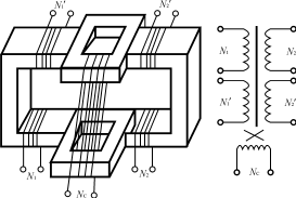 從20世紀80年代末開始,對由垂直形鐵心構(gòu)成的立體布置的多功能鐵心結(jié)構(gòu)進行研究的人員越來越多。最早是有人把C形鐵心的一半轉(zhuǎn)90°而形成的,發(fā)現(xiàn)在沒轉(zhuǎn)90°的C形鐵心上的繞組之間仍存在變壓器功能,轉(zhuǎn)90°的C形鐵心上繞上一個繞組,可以通過電流激磁后,改變沒轉(zhuǎn)90°的C形鐵心上繞組的電感〔見圖11(a)〕。后來把鐵心去掉一些變成圖11(b),仍然具有這樣的功能。圖11(c)是把兩個變壓器和兩個可控電感組合在一起的多功能鐵心結(jié)構(gòu)。