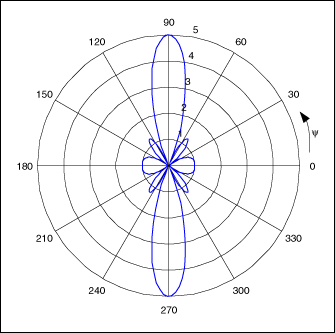 圖2.五單元天線矩陣(單元間相差為零)產(chǎn)生的輻射圖,天線位于原點(diǎn),沿x軸以半波長為間距。[page]