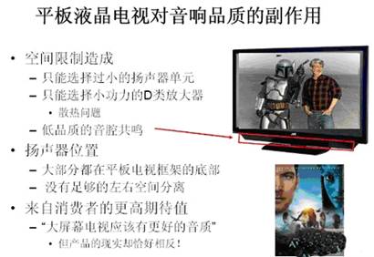 他指出要設(shè)計(jì)好的電視音響則需要有好的揚(yáng)聲器單元、大的電視機(jī)空間(便于散熱)、更好的揚(yáng)聲器空間分離(實(shí)現(xiàn)雙聲道立體聲效果)、對(duì)低頻補(bǔ)償,但是看看現(xiàn)在平板電視,基本是否定了這些要素:例如LCD-TV在采用LED背光后變的更薄、很多液晶電視的音箱放置于電視底端造成空間分離不明顯、由于電視變薄散熱問(wèn)題加劇廠商把音頻輸出功率降低,所有這一切造成了了一個(gè)后果:電視機(jī)屏幕越大聽覺(jué)體驗(yàn)越差!