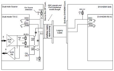 由于在DisplayPort推出之際,HDMI和DVI已經(jīng)存在,所以DisplayPort源設(shè)備必須與現(xiàn)有的HDMI和DVISink設(shè)備能夠互操作。為滿足這個(gè)要求,實(shí)際上所有的DisplayPort數(shù)據(jù)源設(shè)備都是“雙模”設(shè)備,即同時(shí)支持DisplayPort(直接連接),并通過一個(gè)便宜的線纜適配器(“dongle”)來支持DVI/HDMI。