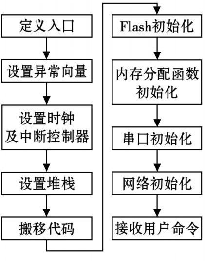 本設(shè)計中采用了帶有SNMP協(xié)議的μClinux操作系統(tǒng),實現(xiàn)方式簡單。不僅完成了串行接口到網(wǎng)絡(luò)接口的轉(zhuǎn)換,還使用戶可以通過監(jiān)控界面按照SNMP協(xié)議標(biāo)準(zhǔn)進行統(tǒng)一管理。對于μClinux系統(tǒng)U-boot是最合適的Bootloader,其設(shè)計過程如圖5所示。