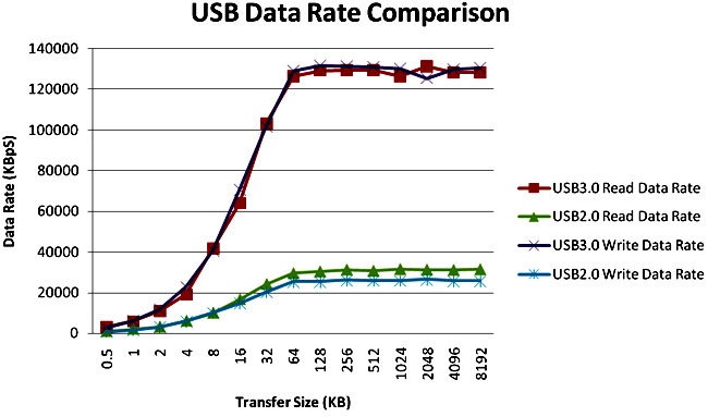 USB 2.0和USB 3.0的基本區(qū)別是帶寬。USB 2.0所提供的理論帶寬是480Mbps。事實(shí)上,收到的最大吞吐量約為320Mbps (40MBps),它大致是理論值的三分之二。使用USB3.0,數(shù)據(jù)吞吐量為4.8Gbps。如果我們用相同的比例,那么預(yù)期的數(shù)據(jù)速率是3.2Gbps (400MBps)。然而,許多開(kāi)發(fā)人員希望能提供更高的吞吐量。圖1顯示了USB 3.0 和USB 2.0用于Buffalo外部存儲(chǔ)磁盤(pán)進(jìn)行不同大小文件傳輸?shù)臄?shù)據(jù)率差異。應(yīng)該指出的是,USB 3.0數(shù)據(jù)速率受儲(chǔ)存設(shè)備約束,否則400 Mbps的數(shù)據(jù)速率很容易達(dá)到。