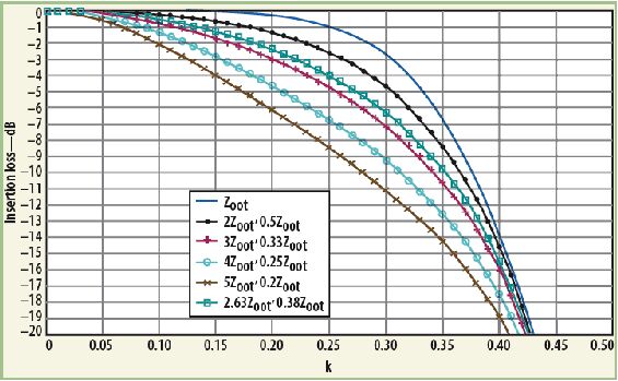 圖4中,對于優(yōu)化和非優(yōu)化的特性阻抗值,都把插損看作k的函數(shù)。相比采用了優(yōu)化特性阻抗的情況,特性阻抗非優(yōu)化時(shí),插損增加,帶寬減小。于是,使用絞合傳輸線很容易獲得最佳特性阻抗值。
