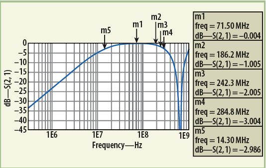 MathWorks的MATLAB數(shù)學(xué)分析軟件曾被用來分析這種變壓器器件模型的響應(yīng)。分析中,把單獨(dú)的低頻(公式1)響應(yīng)和高頻(公式5)響應(yīng)的插損響應(yīng)結(jié)合在了一起。將所需的目標(biāo)值代入MATLAB公式,可獲得寬帶變壓器的最終響應(yīng)。為了執(zhí)行MATLAB模型數(shù)值響應(yīng)的電氣仿真,使用了ADS建模軟件。該軟件有一個(gè)很有用的內(nèi)部源模型,稱為XFERRUTH,其變量參數(shù)包括匝數(shù)(N)、電感因子(AL)、傳輸線特性阻抗(Z)、傳輸線電氣長度(E),以及計(jì)算傳輸線長度所需要的參考頻率(F)。