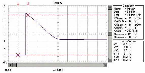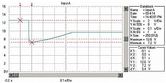 由于RM、RB、RL均非常低,啟動電流非 常大。例如用12V、45Ah的蓄電池啟動安裝1.9升柴油機的汽車,蓄電池的電壓在啟動瞬間由12.6V降到約3.6V!啟動過程的蓄電池電壓波形如圖 1;啟動瞬時的電流達550A,約為蓄電池的12C的放電率!啟動過程的蓄電池電流波形如圖2,(電流傳感器的電流/電壓變換比率:100A/V)。盡管 車用蓄電池是啟動專用蓄電池,可以高倍率放電,但在圖1中可以看出,10倍以上的高倍率放電時的蓄電池性能變得很差,而且,如此高倍率放電對蓄電池的損傷 也是非常明顯的。啟動過程的電壓劇烈變化也是極強的電磁干擾,可以造成電氣設備的“掉電”,迫使電氣設備在發(fā)電機啟動過程結(jié)束后重新上電,計算機在這個過程中非常容易死機。因此,無論從改善汽車電氣設備的電磁環(huán)境還是改善汽車的啟動性能和蓄電池的性能、延長使用壽命來考慮,改善汽車電源在啟動過程的性能是必要的。