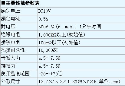 “CIM-J38N”連接器采用了小型、薄型設(shè)計,標(biāo)準(zhǔn)安裝型的物理尺寸為高1.30mm、寬13.7mm、進(jìn)深15.3mm。連接器采用Push-in Push-out推擋方式,卡排出尺寸為3.8mm。同時還附帶防卡彈出止動結(jié)構(gòu)、裝載卡檢測開關(guān)(Normally open型)、RFID接頭,并增強(qiáng)了卡反向插入功能。另外還增強(qiáng)了EMI對策用接地線(Ground)功能。