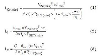 方程式計算得到最大輸入電壓和最小負載時 CCM 運行所需的最小電感。50% 占空比運行(VIN 等于 VOUT 時出現(xiàn))和統(tǒng)一效率條件下,比較這些方程式可知,方程式 1 中耦合電感的計算值是非耦合電感計算值的兩倍。由于轉(zhuǎn)換器肯定會有損耗,而大多數(shù)輸入電壓源均有很大不同,因此這種簡化了的電感泛化一般為錯誤的;但它通常足以應付除極端情況以外的所有情況。它一般意味著,轉(zhuǎn)換器會比預期稍快一點進入非連續(xù)導通模式 (DCM) 運行,其在大多數(shù)情況下仍然可以接受。如前所述,使用非耦合電感時,正如我們通常假設的那樣,無需輸出端電感的值與輸入端電感一樣;但是為了簡單起見肯定會這樣做。利用 VOUT/VIN 調(diào)節(jié)輸入端電感,便可確定輸出端電感值。使用更小值輸出端電感的好處是,它一般尺寸更小而且成本更低。