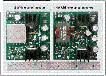 “表 1”所示規(guī)范為設計比較的基礎。第一個設計使用一個耦合電感,而第二個則使用兩個非耦合電感。