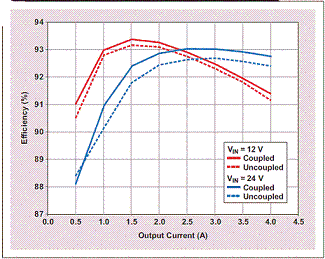 圖 4 耦合和非耦合電感均獲得了較好的效率