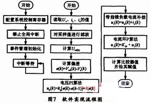 筆者設計了一臺1kVA的逆變電焊電源實驗樣機,其系統(tǒng)的核心控制器是TI的DSP芯片TMS320LF2407A。TMS320LF2407A是一款高性能16位數(shù)字信號處理器,是TI公司定點DSP2000系列中的一員,它是專門為控制與運動控制的數(shù)字化實現(xiàn)而設計的。該DSP可完成逆變器輸出電壓頻率的控制、負載電壓和電流取樣、開關管的導通關斷時間控制等。其軟件實現(xiàn)流程圖如圖7所示。