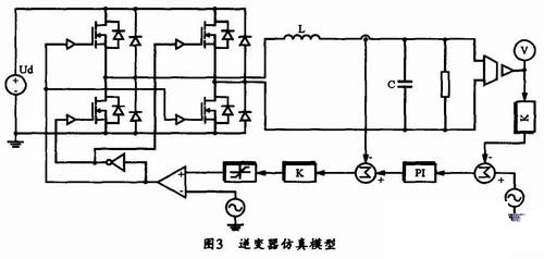 圖3所示是在PSIM下構建的逆變器仿真模型。該模型主要有三部分:主電路、控制器和PWM脈沖生成模塊。其中控制器用于實現(xiàn)電壓電流雙環(huán)控制,為產(chǎn)生PWM脈沖提供調制信號;PWM脈沖生成模塊采用雙極性調制方式。根據(jù)整個系統(tǒng)的閉環(huán)特征方程,并綜合考慮系統(tǒng)的控制要求,再通過選取阻尼比和自然角頻率,就可以得到系統(tǒng)控制器的參數(shù)??紤]到單相全橋逆變器系統(tǒng)控制的性能要求,在此基礎上所確定的最終系統(tǒng)仿真參數(shù)如下: