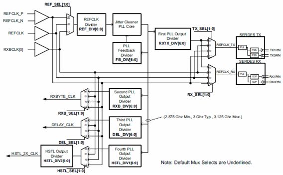 SERDES實現(xiàn)的一個關鍵技術是時鐘的產生和分布,圖5是TLK3132芯片內部的時鐘架構。時鐘配置非常靈活,支持單端或差分參考時鐘輸入,同時包括多個高頻鎖相環(huán)電路: