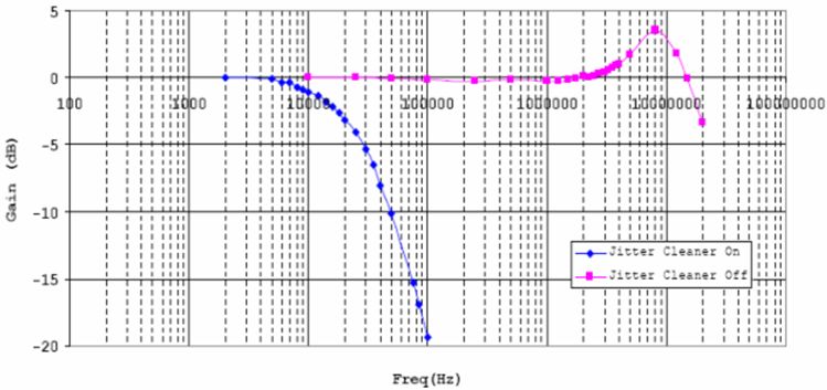 2)由于串并模塊里的高頻倍頻器環(huán)路帶寬很大,最大可達30MHz左右。故TLK3132內部集成了一顆基于LC振蕩器的抖動濾除鎖相環(huán),環(huán)路帶寬通常設置在幾百KHz以內,可以對輸入?yún)⒖紩r鐘進行濾除,降低參考時鐘對幾百KHz 以上抖動性能的要求,圖6是TLK3132發(fā)送鏈路在抖動濾除器打開和關閉下的環(huán)路傳遞函數(shù)。此外,抖動濾除器也可對鏈路恢復的時鐘(只可接收CH0通道的恢復時鐘RXBCLK(0))進行抖動濾除,提高恢復時鐘的信號質量。