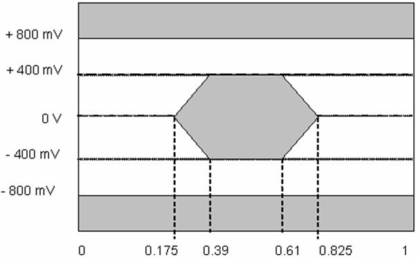 在高速數(shù)據(jù)鏈路通信中,抖動指標是非常關鍵的,CPRI接口相應推薦了高速串行信號的眼圖和抖動規(guī)格。在SERDES發(fā)送側,CPRI要求的眼圖模板如圖8所示。