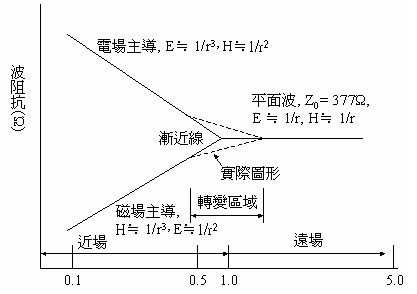 近場(chǎng)(near field)(磁和電的成份)和遠(yuǎn)場(chǎng)的關(guān)系,如附圖一所示。所有的波都是磁場(chǎng)和電場(chǎng)成份的組合。這種組合稱作「Poynting向量」。實(shí)際上,是沒有一個(gè)單獨(dú)的電波或磁波存在的。我們之所以能夠測(cè)量到平面波,是因?yàn)閷?duì)一個(gè)小天線而言,在距離來源端數(shù)個(gè)波長(zhǎng)的地方,其波前(wavefront)看起來像平面一樣。