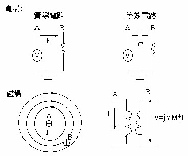 就Maxwell方程式的大多數(shù)應(yīng)用而言,噪聲耦合方法可以代表等效組件的模型。例如:在兩個(gè)導(dǎo)體之間的一個(gè)時(shí)變電場(chǎng),可以代表一個(gè)電容。在相同的兩導(dǎo)體之間,一個(gè)時(shí)變磁場(chǎng)可以代表互感(mutual inductance)。附圖二表示這兩種噪聲耦合機(jī)制。