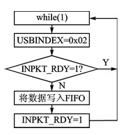 下面以IN端點(diǎn)2為例,說明數(shù)據(jù)如何通過USB接口傳遞到電腦上。當(dāng)電腦發(fā)出IN請(qǐng)求時(shí),如果USB端點(diǎn)2的FIFO非空,就向電腦發(fā)送FIFO里的內(nèi)容;如果FIFO為空,則向電腦發(fā)送一個(gè)空包作為回應(yīng)。CC2531通過寄存器位USBCSIL.INPKT_RDY來控制電腦和8051 MCU內(nèi)核對(duì)USB的FIFO的使用權(quán)。當(dāng)INPKT_RDY=1時(shí),電腦正在對(duì)USB端口進(jìn)行訪問,8051 MCU內(nèi)核無法向FIFO內(nèi)寫入數(shù)據(jù);當(dāng)INPKT_RDY=0時(shí),8051 MCU內(nèi)核可以將發(fā)送數(shù)據(jù)寫入FIFO內(nèi),置位INPKT_RDY=1,完成數(shù)據(jù)的上傳。其流程如圖4所示。