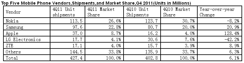 2011 年第四季度,全球共賣出4.274 億部手機(jī).同比去年( 4.028 億部)上升6.1 % ,這一漲勢高于IDC此前預(yù)測的4.4 % 漲幅,但低于2011 年第三季度9.3%的增幅。其中功能機(jī)的市場份額比預(yù)期的衰減速度更快,市場增幅為兩年來最低。