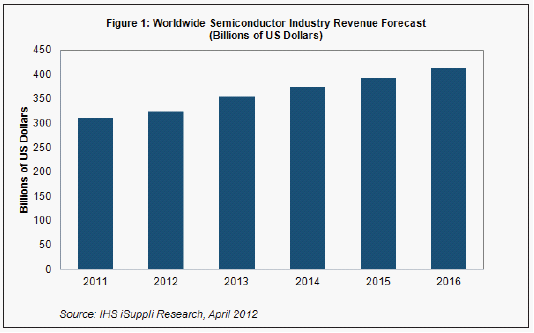 預計2012年半導體營業(yè)收入將達到3246億美元,比去年的3114億美元增長4%。與去年1%的增長率相比,今年增長情況有所改善,而且所有信號都顯示,隨著全球經(jīng)濟趨于穩(wěn)定,半導體產(chǎn)業(yè)將重新站穩(wěn)腳跟。除非全球市場出現(xiàn)意外的經(jīng)濟下滑或者半導體產(chǎn)業(yè)出現(xiàn)重大失策,否則營業(yè)收入未來幾年將繼續(xù)上升,到2016年將達到4128億美元左右,如圖1所示。