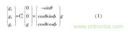 其中,Cbn為慣性坐標(biāo)系到載體坐標(biāo)系的變換矩陣;θ 為俯仰角;φ為橫滾角;g 為重力加速度; 可以通過測量重力加速度分量gx、gy、gz,計(jì)算出平衡車俯仰角θ1和橫滾角φ1估計(jì)值