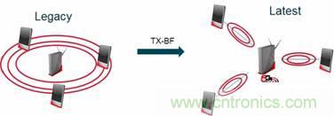 圖1. 借助 802.11ac(和802.11n)波束成形技術(shù),無(wú)論周邊有多少設(shè)備,集線器或AP都能讓無(wú)線信號(hào)直接傳向需要信號(hào)的設(shè)備。與此形成對(duì)比的是,傳統(tǒng)Wi-Fi技術(shù)只能在設(shè)定區(qū)域輻射無(wú)線信號(hào),而該區(qū)域內(nèi)的任何設(shè)備都能接收該信號(hào)。