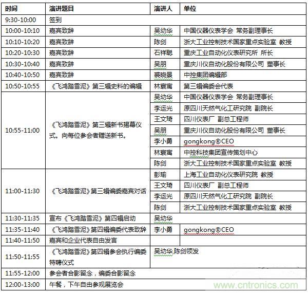 中國(guó)儀器儀表學(xué)會(huì)常務(wù)副理事長(zhǎng)吳幼華,浙大工業(yè)控制技術(shù)國(guó)家重點(diǎn)實(shí)驗(yàn)室陳劍教授,重慶工業(yè)自動(dòng)化儀表研究所石祥聰所長(zhǎng),重慶川儀自動(dòng)化股份有限公司總經(jīng)理吳朋,中控集團(tuán)編輯部裘曉景將分別發(fā)表致辭,闡述中國(guó)儀表和自動(dòng)化的發(fā)展與現(xiàn)狀。林寰寓將代表第三輯編委會(huì)與大家分享《飛鴻踏雪泥》第三輯史料編輯的心路歷程,gongkong®CEO李小勇將與吳幼華、李運(yùn)光、王文琦等專家一起參加《飛鴻踏雪泥》第三輯新書揭幕儀式及嘉賓對(duì)話環(huán)節(jié)。李小勇先生還將代表《飛鴻踏雪泥》第四輯編委,發(fā)表致辭,預(yù)祝第四輯出版成功!