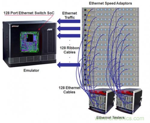今天,以太網(wǎng)交換機和路由器已達(dá)到 256 個端口(到年底將會增加到 1024 個端口),而且它們可處理高達(dá) 120 Gb/s 的流量。同時,網(wǎng)絡(luò)交換的延遲也在持續(xù)下降中,最低延遲已降至 1 µs。所有這些因素促使如今的網(wǎng)絡(luò)交換機和路由器芯片成為有史以來最大規(guī)模的芯片,達(dá)到了五億門級。在流片完成之前驗證此類復(fù)雜 IC 設(shè)計是一項難以完成的任務(wù)。我們來考慮下具有 128 端口以太網(wǎng)接口的 SoC 設(shè)計。